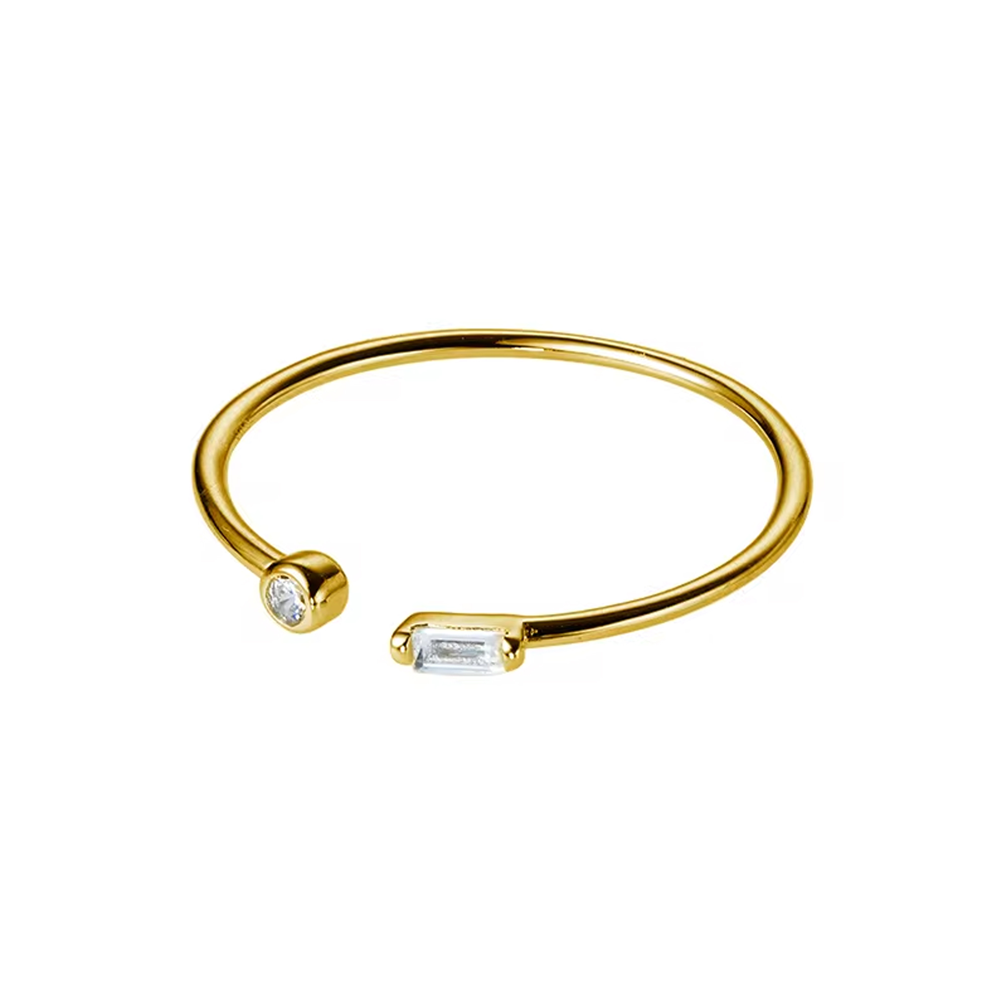 Un diseño elegante con un sutil contraste de formas. Este anillo está elaborado en plata italiana con un delicado enchapado en oro y dos circones blancos: uno redondo y otro rectangular, que aportan brillo y un toque moderno. Su formato ajustable lo hace cómodo y fácil de adaptar a distintas medidas, ideal para usar todos los días o para regalar.