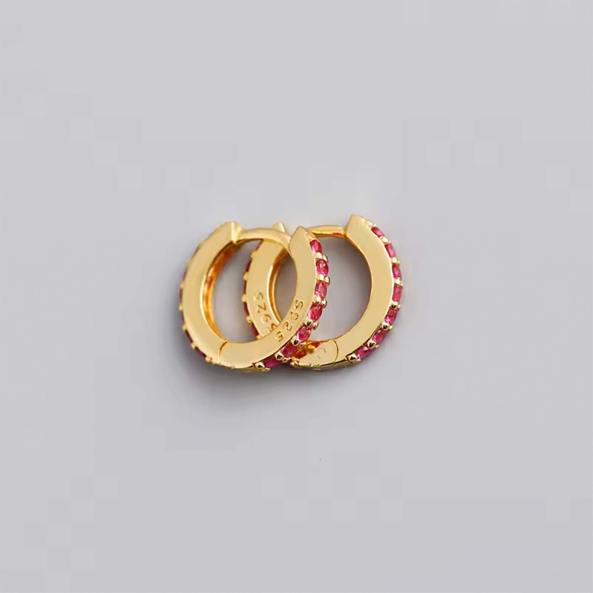 Estos elegantes aros tipo argolla, elaborados en plata 925 y enchapados en oro, destacan por su diseño clásico y sofisticado. Adornados con circones brillantes, añaden un toque de lujo y luminosidad, perfectos para realzar cualquier look con sutileza y estilo.