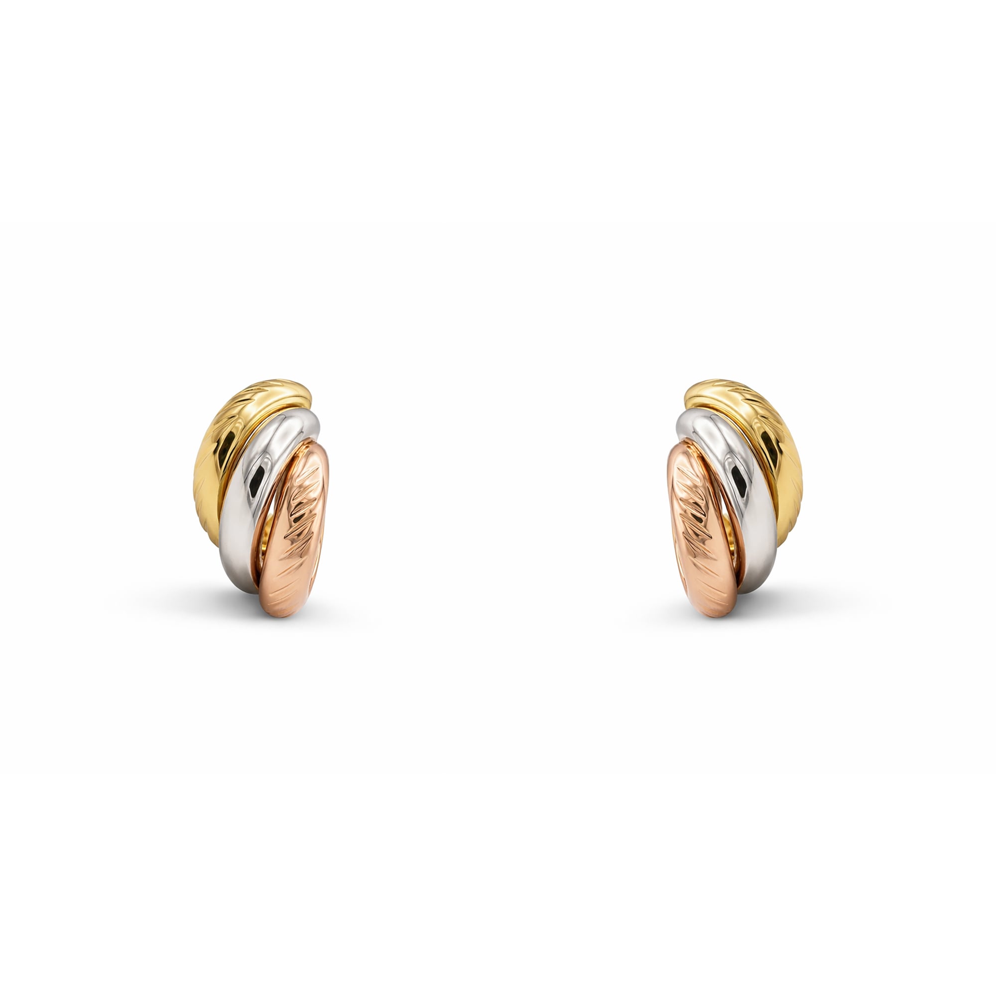 Aros elaborados en oro con diseño entrelazado en tres colores, combinando oro amarillo, blanco y rosado. Las formas se cruzan de manera armoniosa, creando un efecto dinámico y un contraste elegante entre los distintos tonos del metal. Es un modelo llamativo pero equilibrado, ideal para complementar distintos estilos.