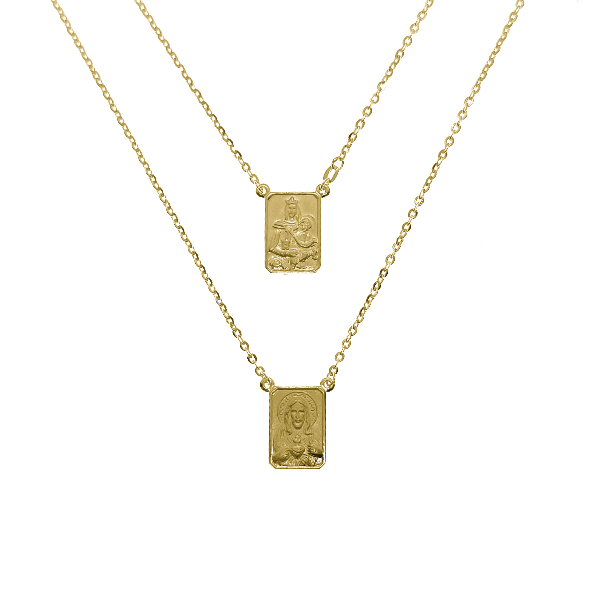 Collar tipo escapulario fabricado en oro amarillo italiano, compuesto por dos medallas planas conectadas por una cadena fina del mismo material. Cada medalla incluye un grabado en relieve: una representa a la Virgen del Carmen y la otra al Sagrado Corazón de Jesús, ambos en estilo clásico.