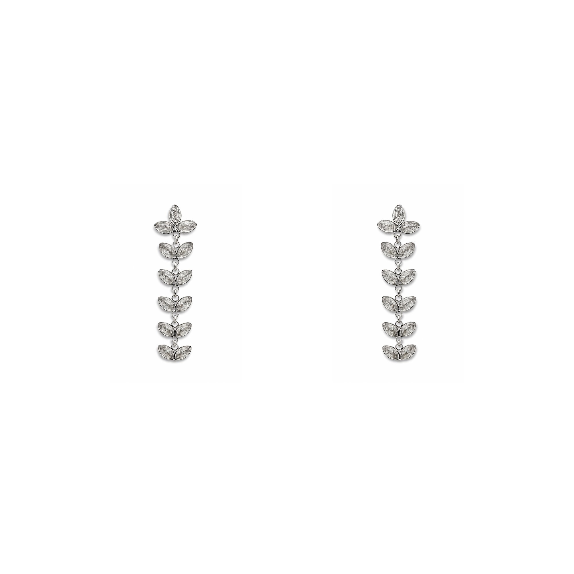 Par de aros elaborados en plata con filigrana paraguaya, trabajados con delicados diseños de hojitas colgantes que aportan movimiento y ligereza. El tejido fino y los detalles bien definidos realzan el brillo del metal, logrando una pieza elegante y cómoda para usar en distintas ocasiones.