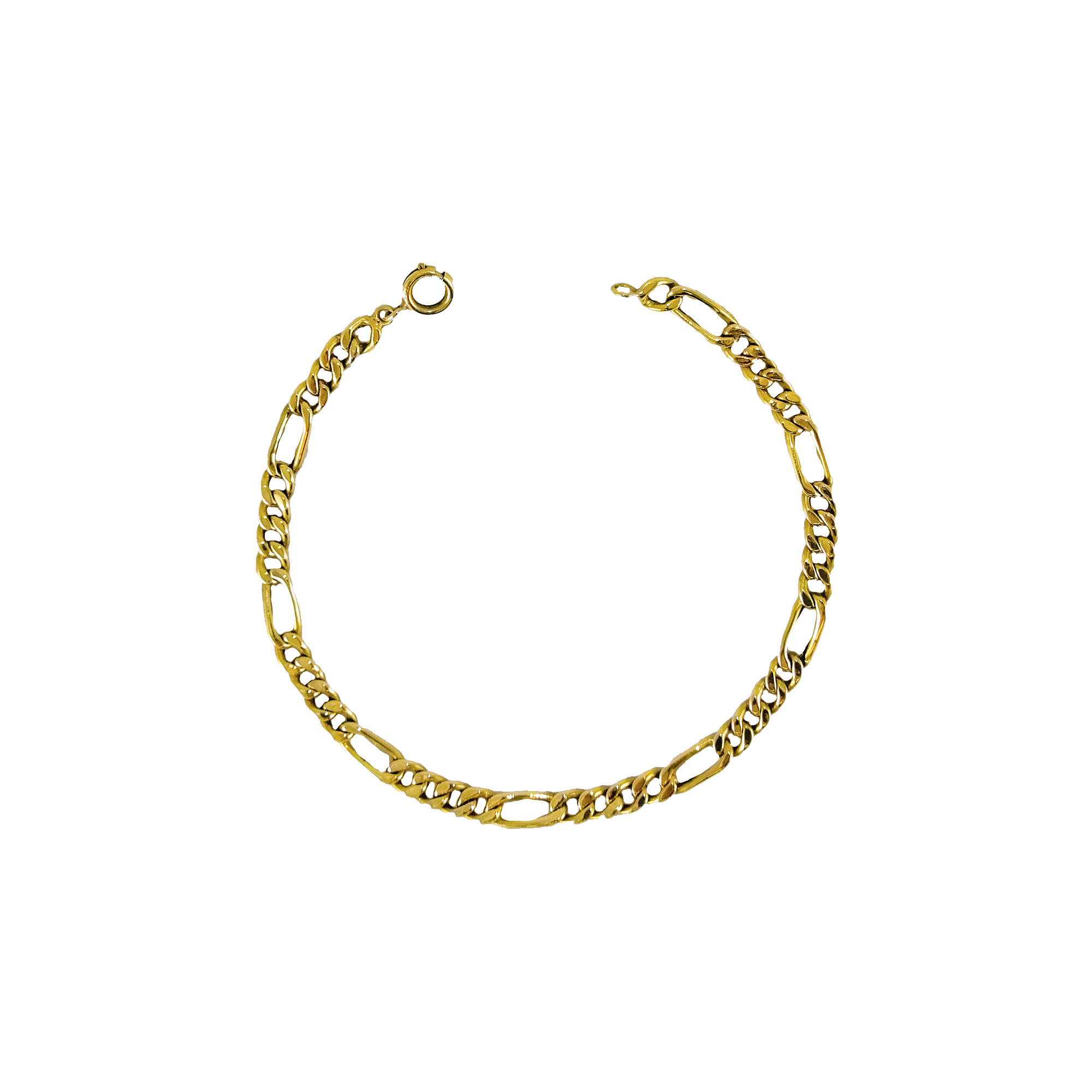 Un clásico de la joyería que nunca pasa de moda. Esta pulsera está elaborada en oro amarillo nacional de 18 quilates, con el tradicional diseño Fígaro, caracterizado por su secuencia de eslabones alargados y redondos. Una pieza elegante y resistente, ideal para uso diario o para complementar cualquier estilo con un toque de distinción.