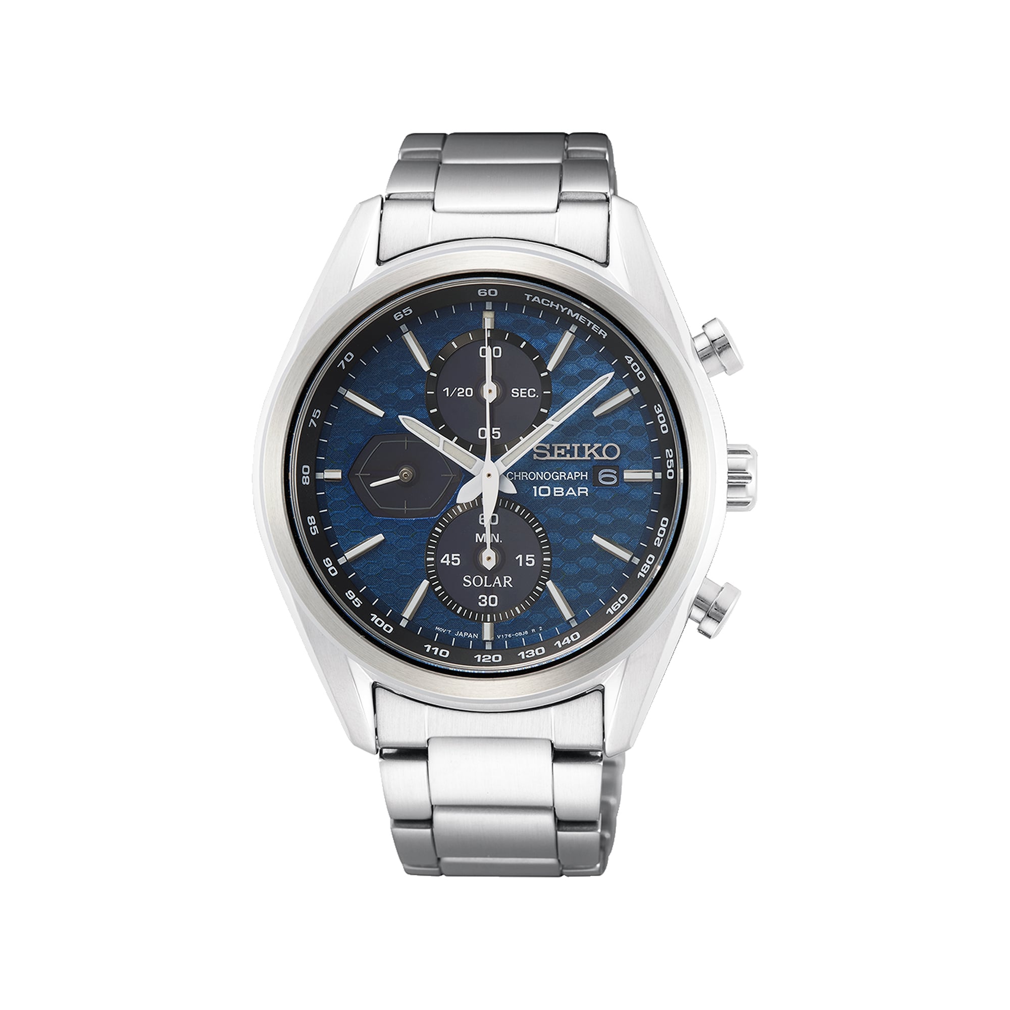 Reloj Seiko con caja y correa de acero inoxidable, diseñado con un diámetro de 41.4 mm que aporta una presencia firme y equilibrada en la muñeca. Incorpora movimiento solar, que se carga con luz y elimina la necesidad de cambio de batería. Cuenta con cronómetro de hasta 60 minutos con medición en décimas de segundo, además de indicador de fecha, lo que lo convierte en una opción práctica para el uso diario.