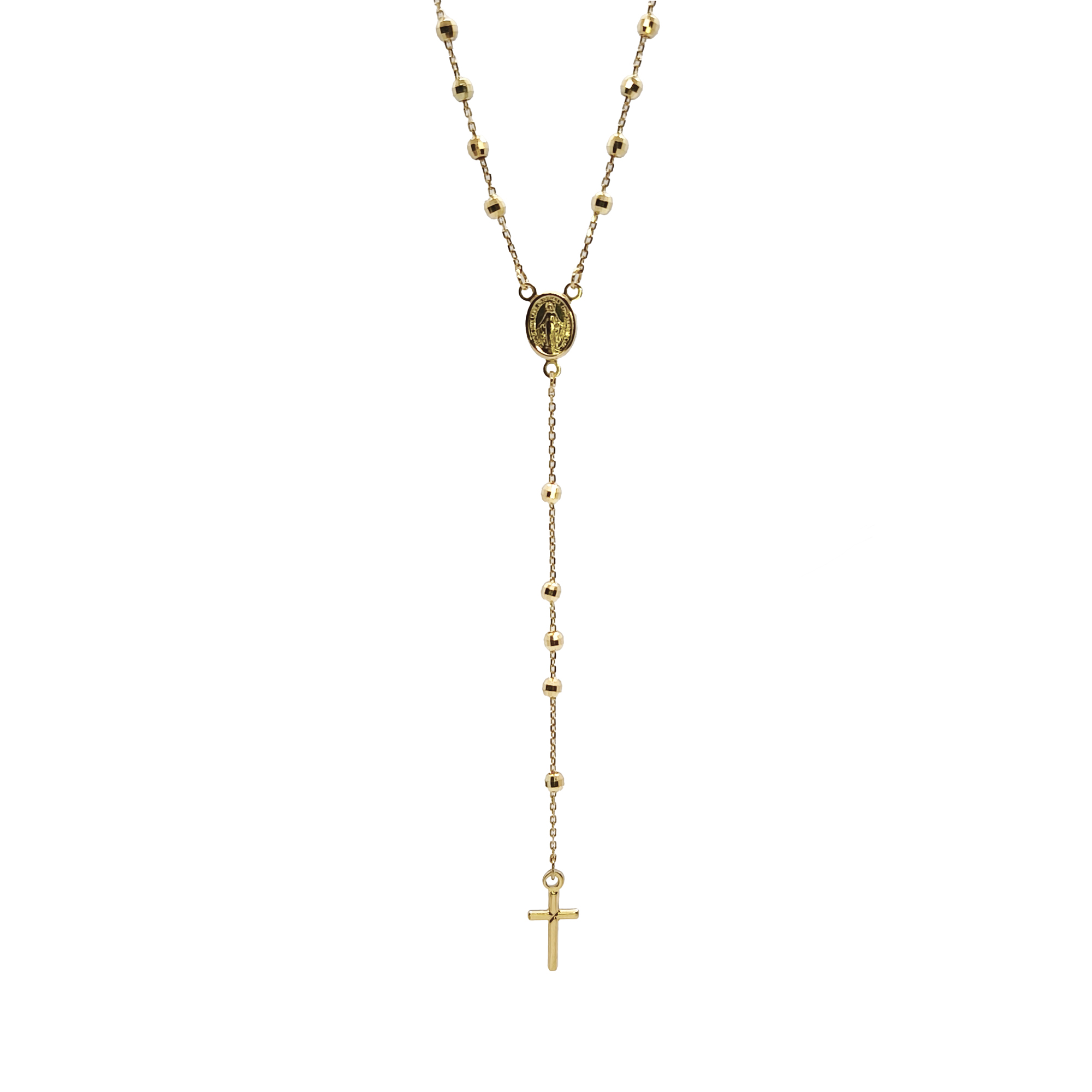 Un diseño clásico con un detalle refinado. Este rosario está elaborado en oro amarillo 18K italiano y se distingue por sus cuentas facetadas, que aportan un brillo especial con cada movimiento. Incorpora una cruz simple de líneas limpias, que realza la elegancia del conjunto sin perder sobriedad. Con un largo de 45 cm, es una pieza ligera, cómoda y llena de significado, ideal para quienes buscan una joya de calidad con estilo tradicional.