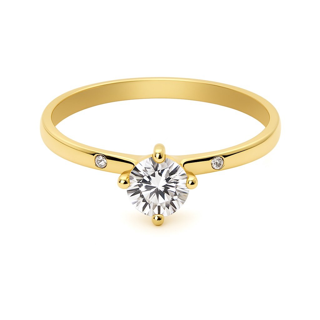 Un diseño clásico con un toque de brillo adicional. Este anillo solitario está elaborado en oro amarillo y cuenta con un circón central de corte brillante, acompañado por una piedra a cada lado que realza su luminosidad. Una joya elegante y equilibrada, ideal para ocasiones especiales o para llevar todos los días con estilo.