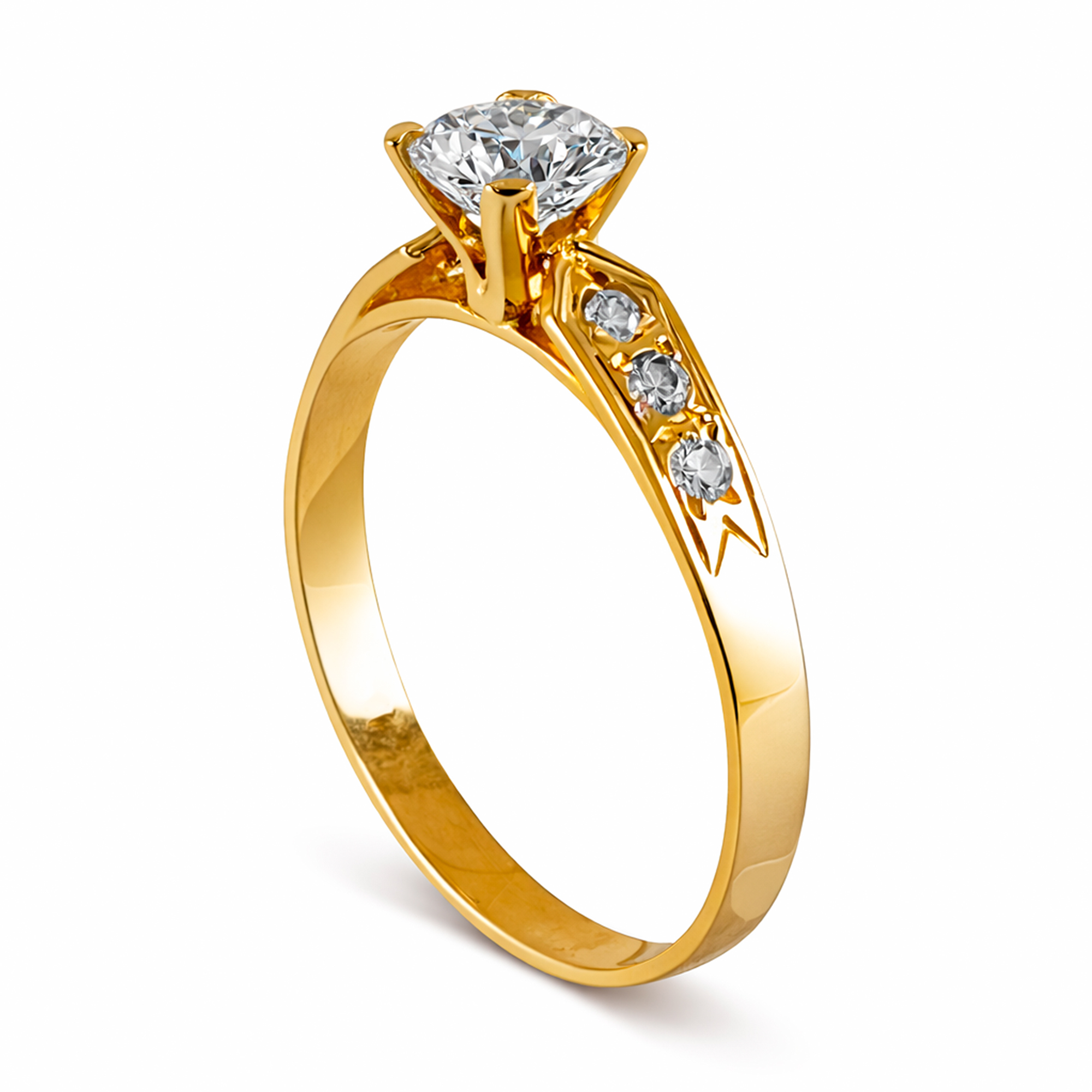 Solitario de oro amarillo 18K con circones al costado y circón en el centro.