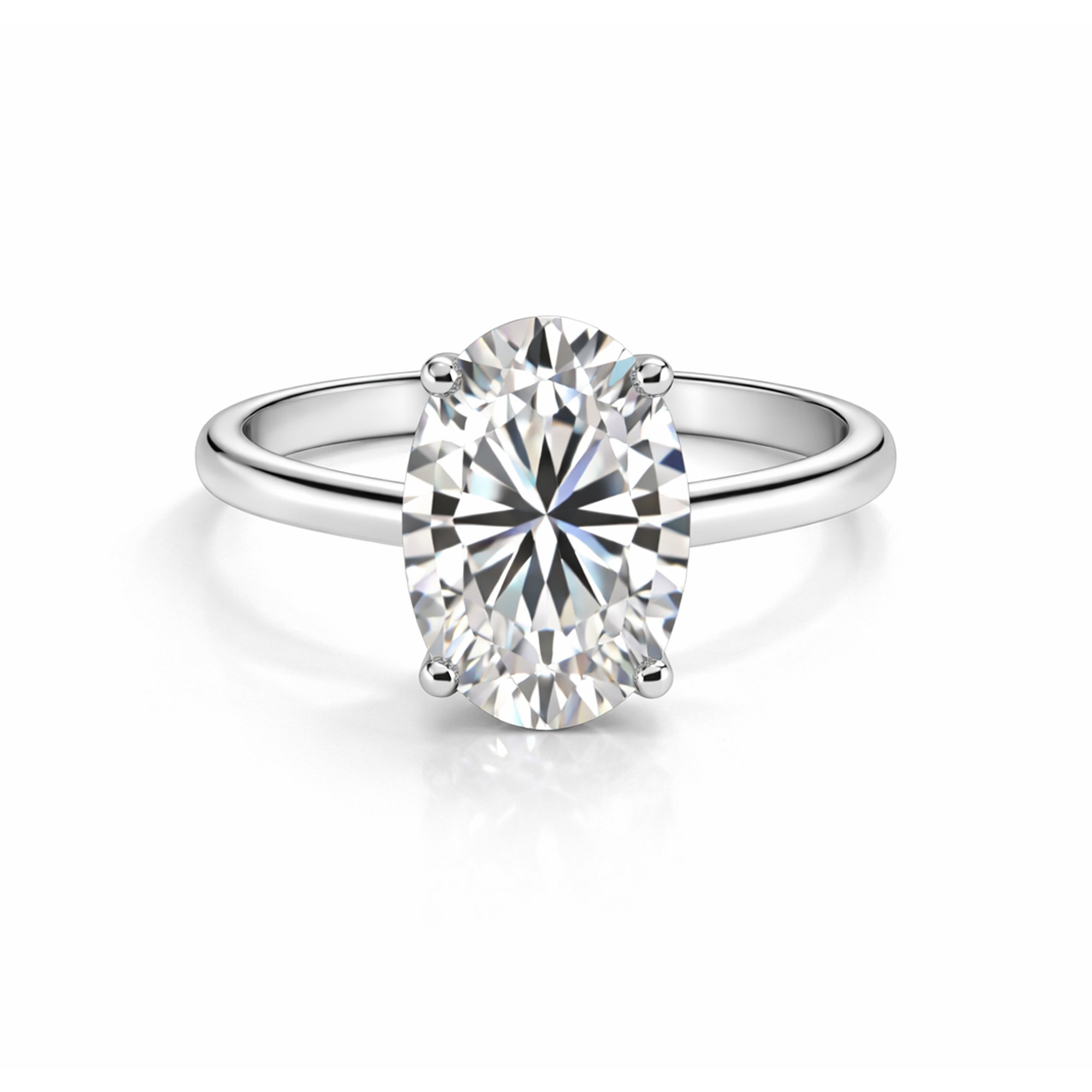 Solitario elaborado en oro blanco 18K con una moissanita corte oval de 4.0 ct como piedra central. Su forma alargada estiliza la mano y permite una excelente entrada de luz, resaltando el brillo y la definición de la piedra desde distintos ángulos. Es un anillo de gran presencia, ideal para quienes buscan un diseño llamativo y bien proporcionado.